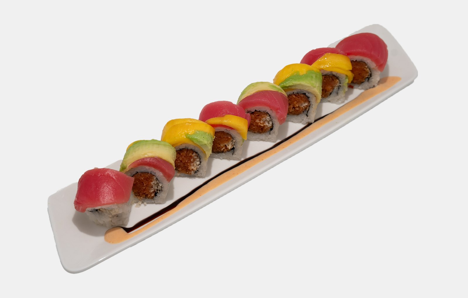 spicy tuna with tempura flakes rolled and topped with tuna, mango, avocado, spicy mayo, and eel sauce