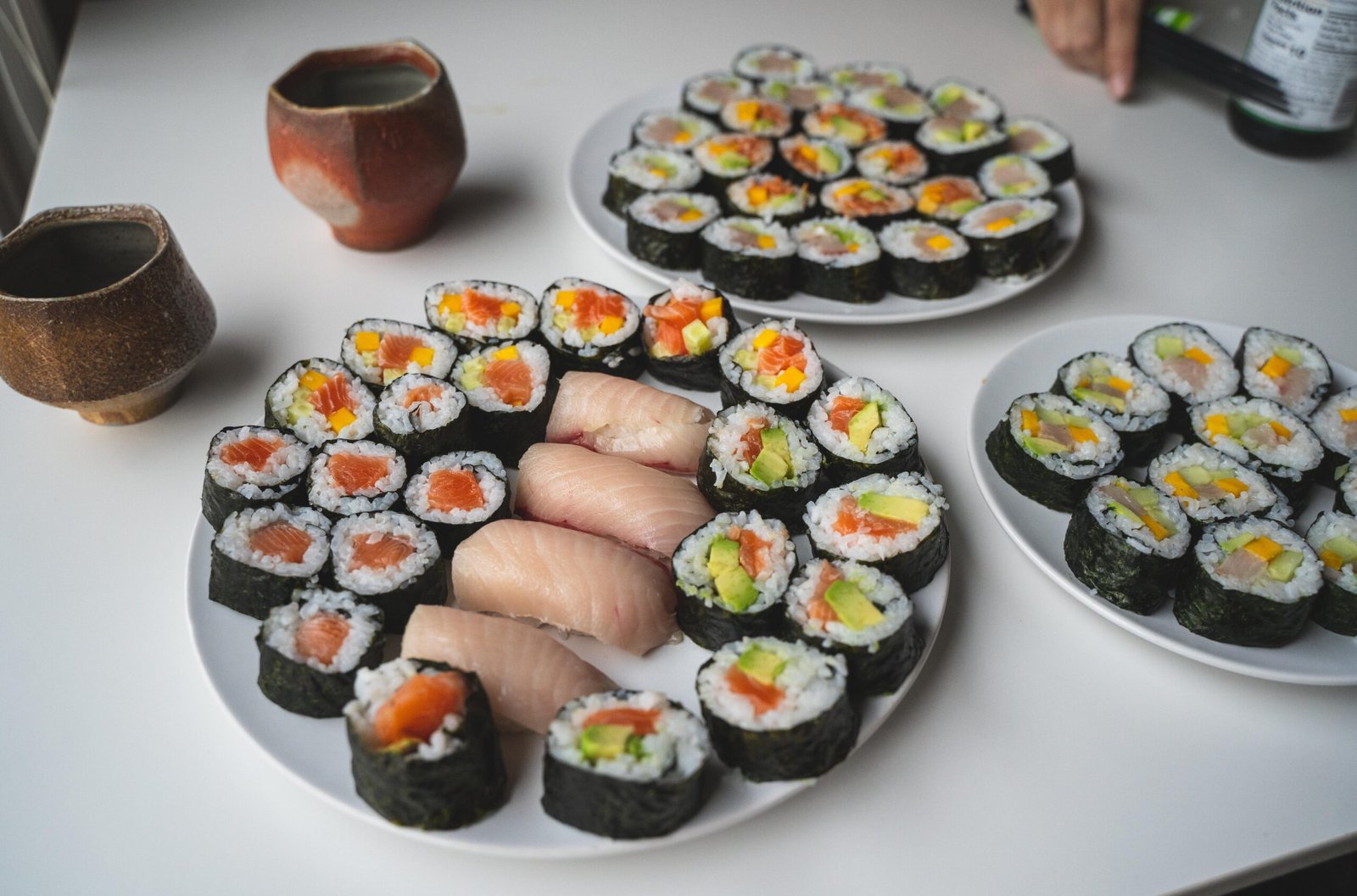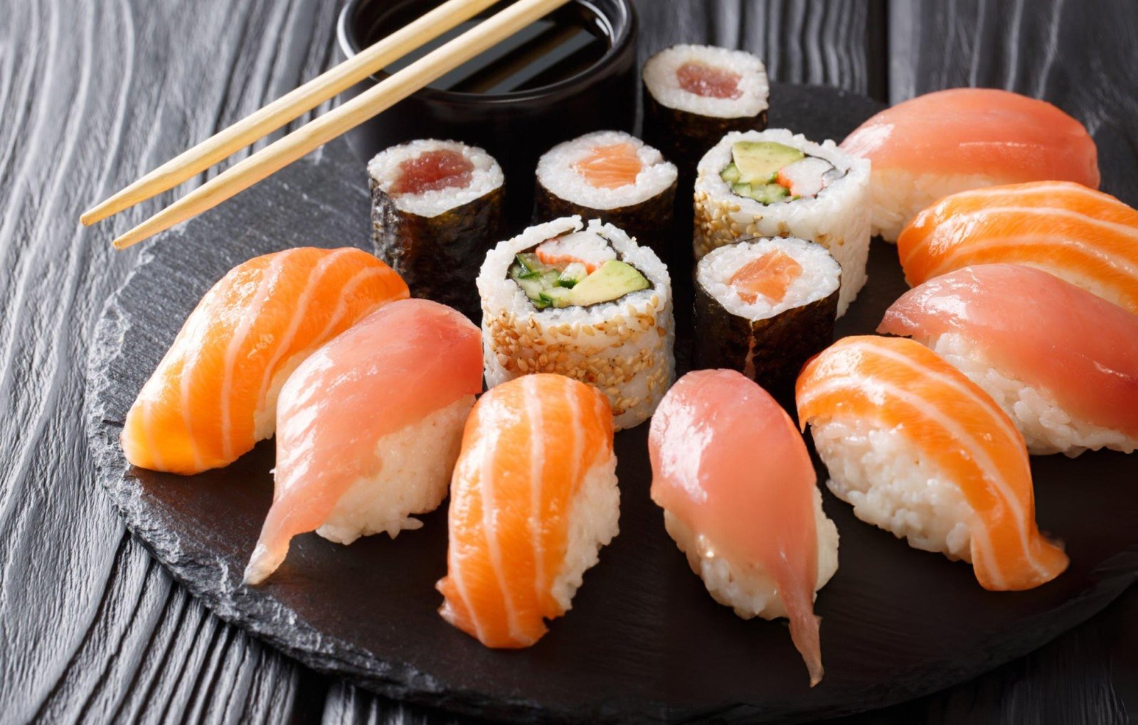 4 pcs salmon sushi, 4 pcs sashimi, 6 pcs salmon roll